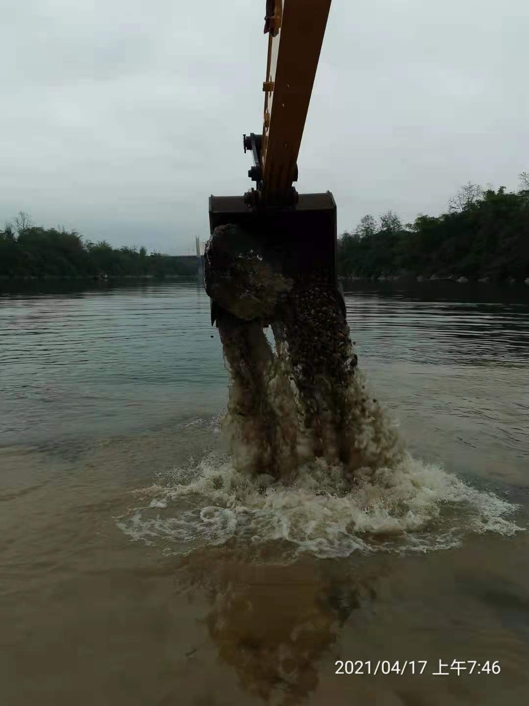 為了避免管道彎曲,要隨時監(jiān)控和調節(jié)空管部分內的氣壓,必要時可以通入壓縮空氣使管道沉降逆轉。在沉降中還要在管道外端施加的拖力來減小發(fā)生壓屈失穩(wěn)的危險。 卵石層開挖放樣結束和施工船舶和開挖設備的調試后,開始對卵石覆蓋層進行開挖清理,盡量開挖到基巖。卵石層開挖深度較淺,至深處僅7.5m,采用水上臂挖掘機即可進行表層卵石的開挖。由于單個開挖斷面開挖方量較大,為避免挖出的卵石回塌進溝槽,開挖成型后,由潛水員進行探摸和測量,確保管線安裝。當采用挖掘機開挖時,挖掘機臂必須有足夠的高度和跨度來保證卵石能棄至溝槽頂邊線的下游面進行棄放,以便后期回填使用。